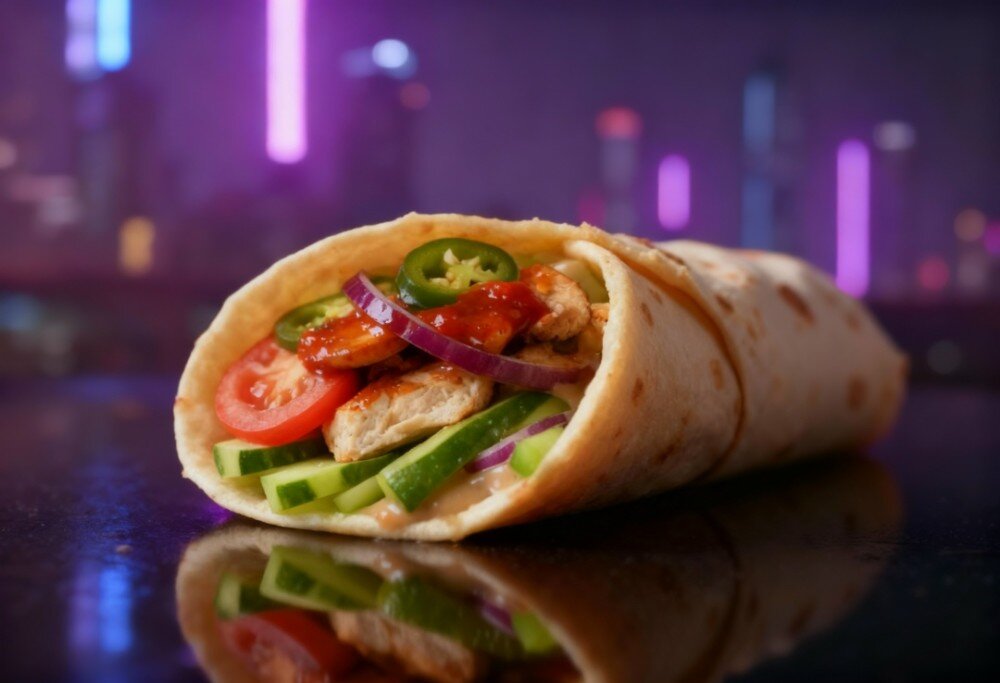 Огурец, томат, красный лук, картофель, халапеньо, филе цыпленка, острый соус